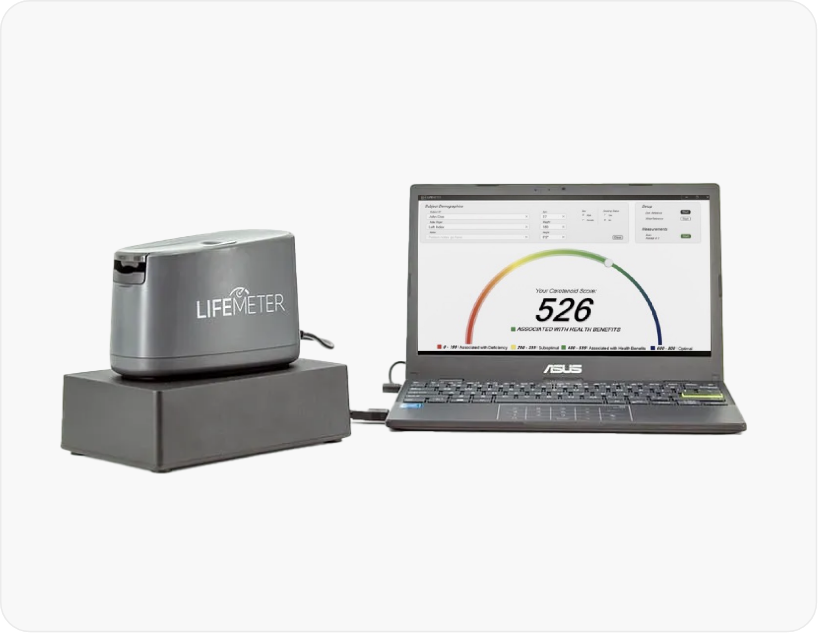 Science has linked skin carotenoid levels to overall health. Low carotenoid levels are a potential risk factor for age-related eye and brain conditions. LifeMeter is a quick, accurate, non-invasive test that measures your carotenoids levels in one minute by scanning your fingertip with no pricks or pokes. It’s a simple way to see if you are eating enough fruits and vegetables.